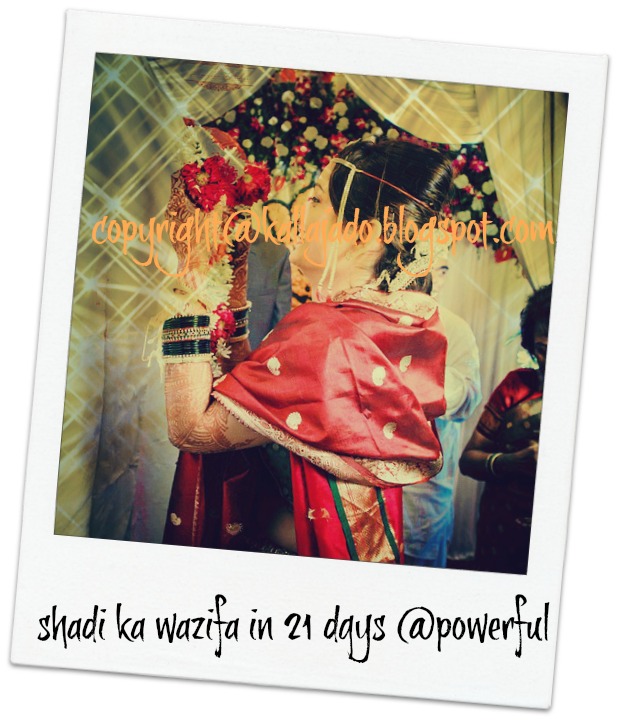 Is wazifa for love aur marriage ke liye buhat he zabdast ha aap ko chai ke is ko nochandi jummerat se shuru kare aur pher lagatar 41 roz tak phere.Amal ko shuru karne se phele naiz o sadqa kare .